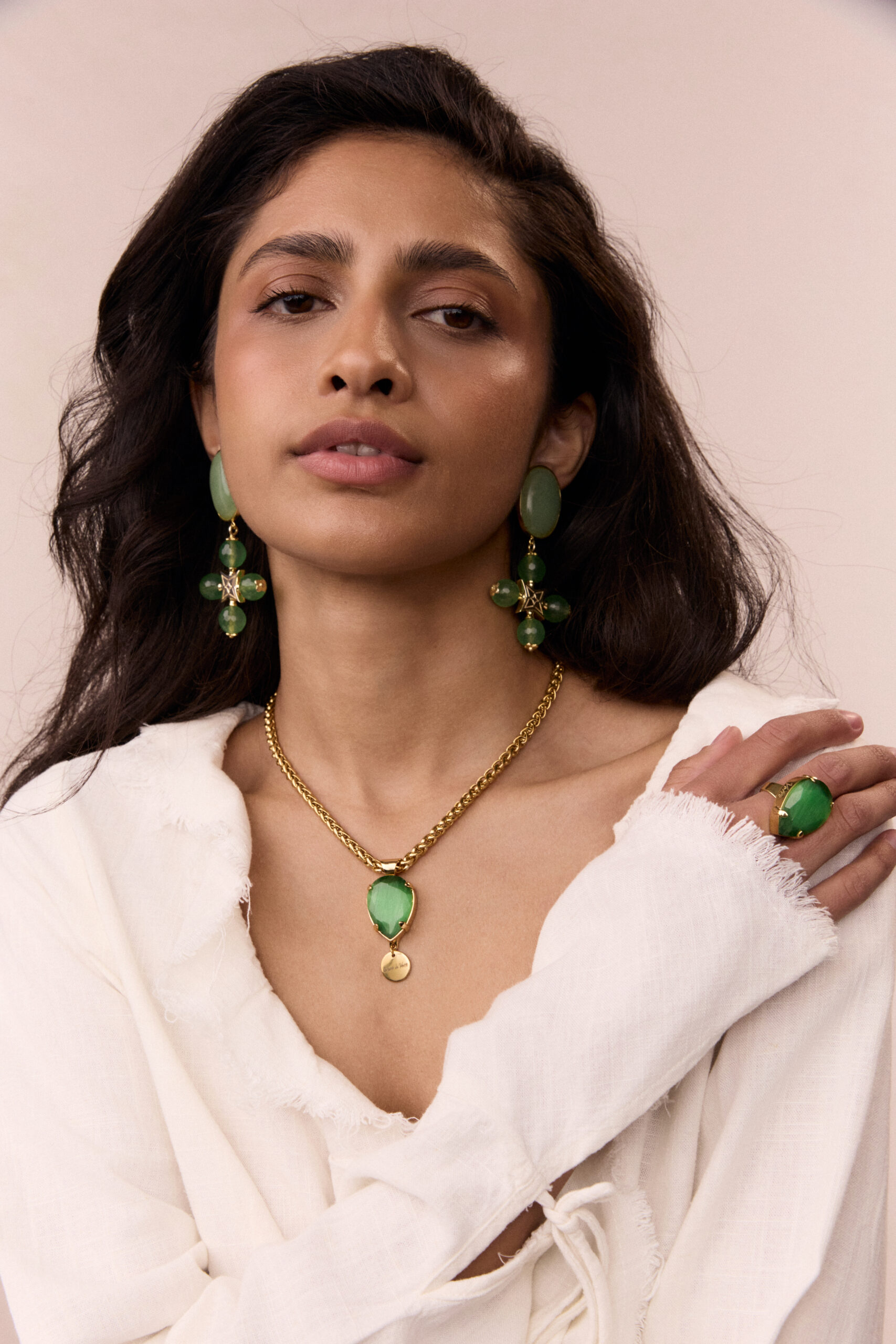 Виготовлено з латуні у позолоті 24 карат та камінців авантюрину. Без нікелю. Довжина: 8 см. Вага: 25 г ( однієї сережки)