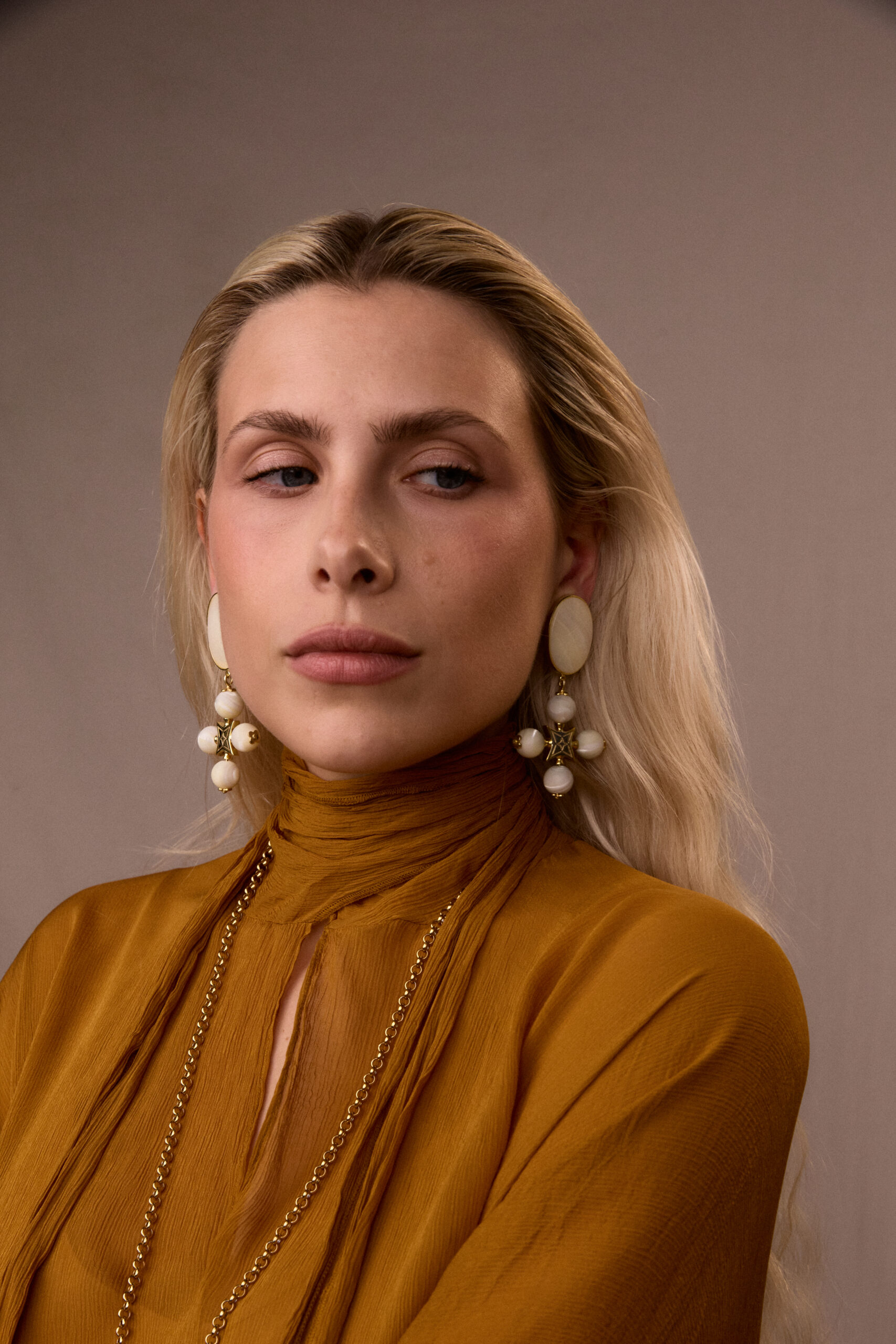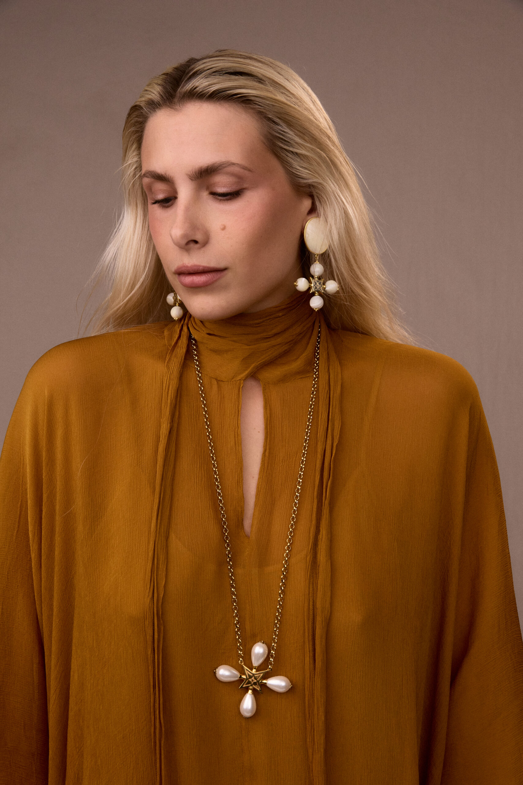 Made of 24k gold-plated brass and mother-of-pearl stones. Nickel free. Earring length: 8 cm. Weight: 25 g (one earring)