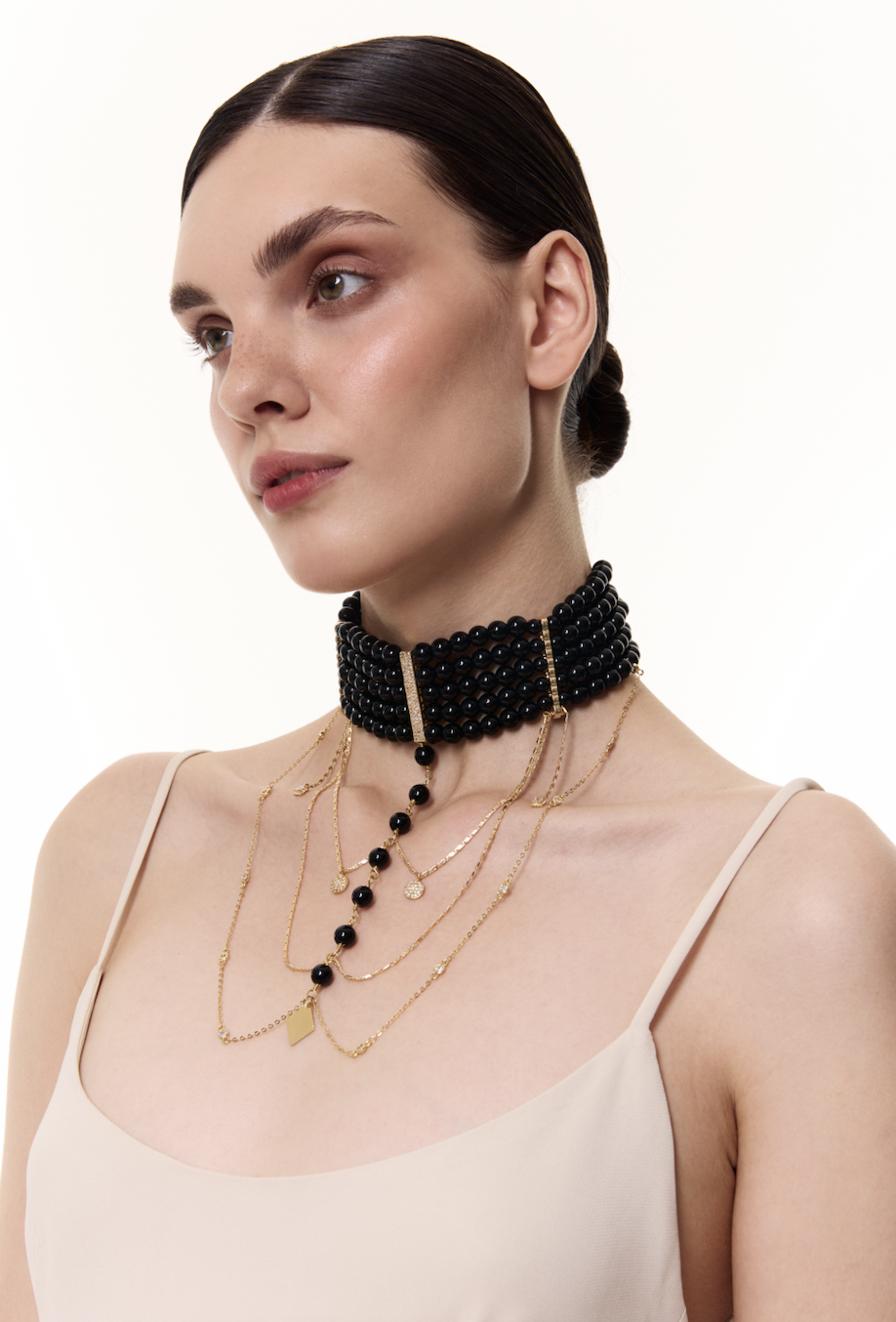 Black agate necklace. Hardware made of gold-plated brass, pendants inlaid with zircons. Nickel-free. Length: 33 cm + 10 cm extension chain.