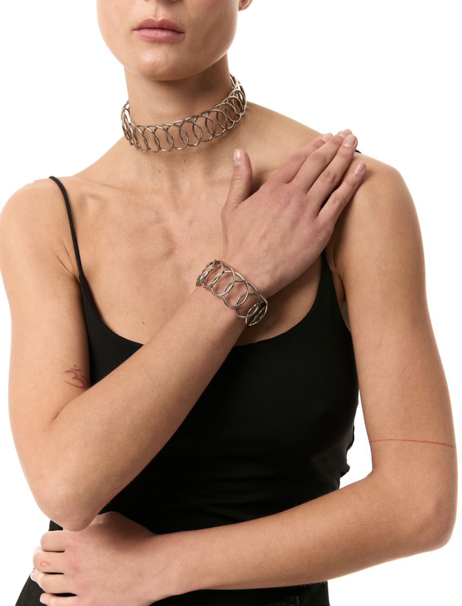 Rhodium-plated copper bracelet. Length of the jewelry is 21 cm, width is 2.5 cm.