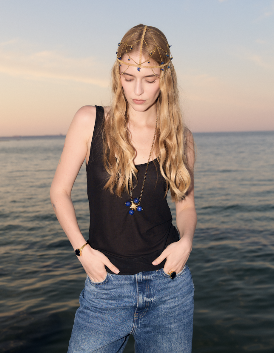 Виготовлено з латуні у позолоті 24 карат та камінців содаліту, ланцюжок – нержавіюча сталь. Довжина – 80 см. Без нікелю.