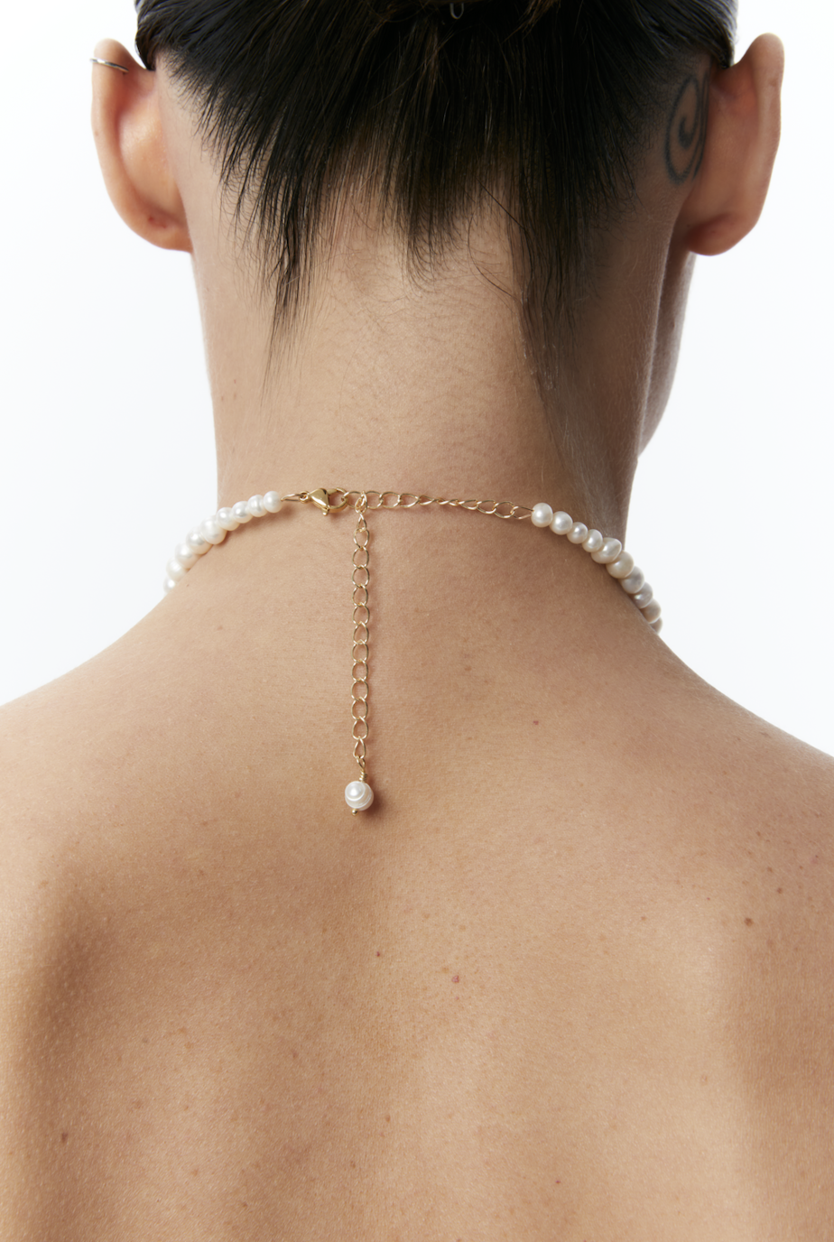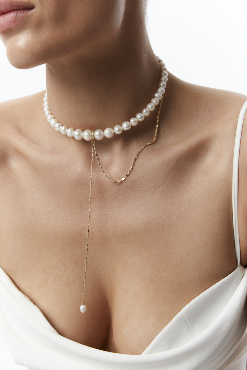 Кольє з натуральних прісноводних перлів.Ланцюжок і фурнітура виготовлені з латуні із 24-каратним золотим напиленням. Довжина:33 см + 10 см подовжуючий ланцюжок.