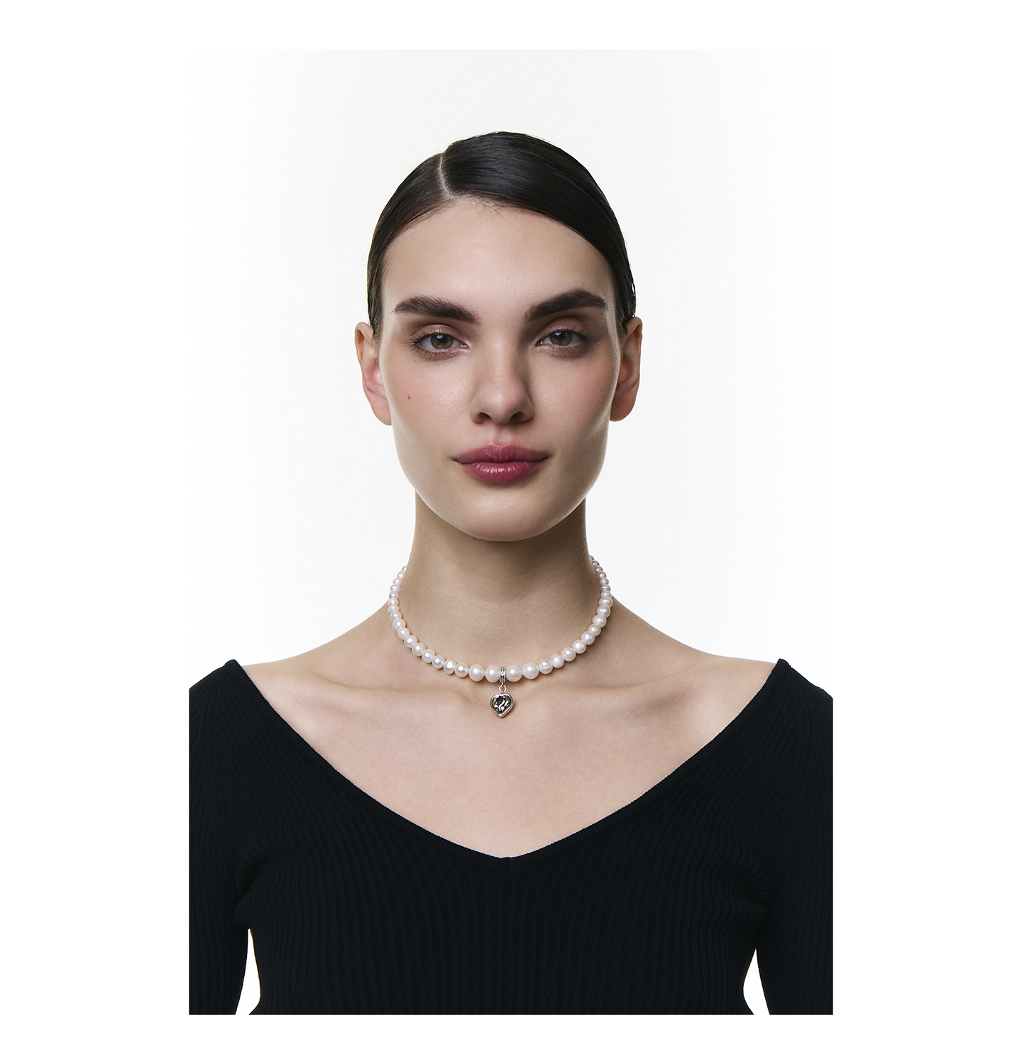 A classic string of pearls becomes a modern choker, and a heart-shaped pendant adds individuality...