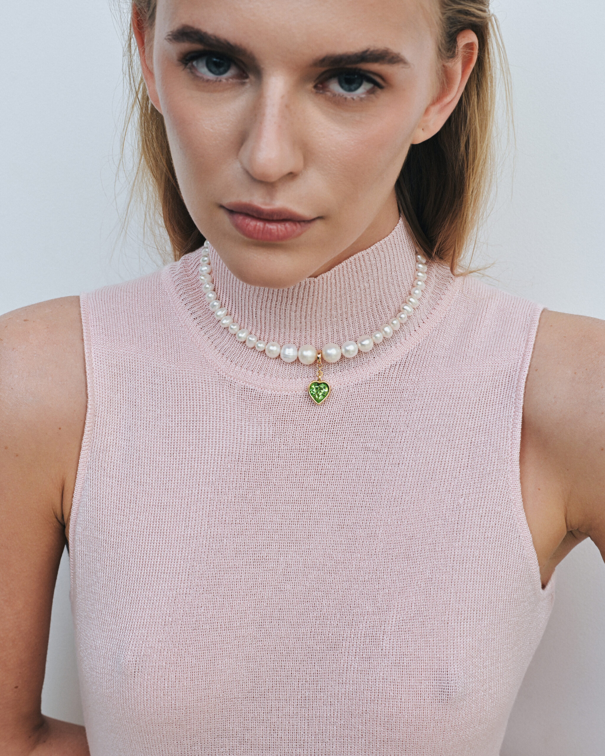 A classic string of pearls becomes a modern choker, and a heart-shaped pendant adds individuality...