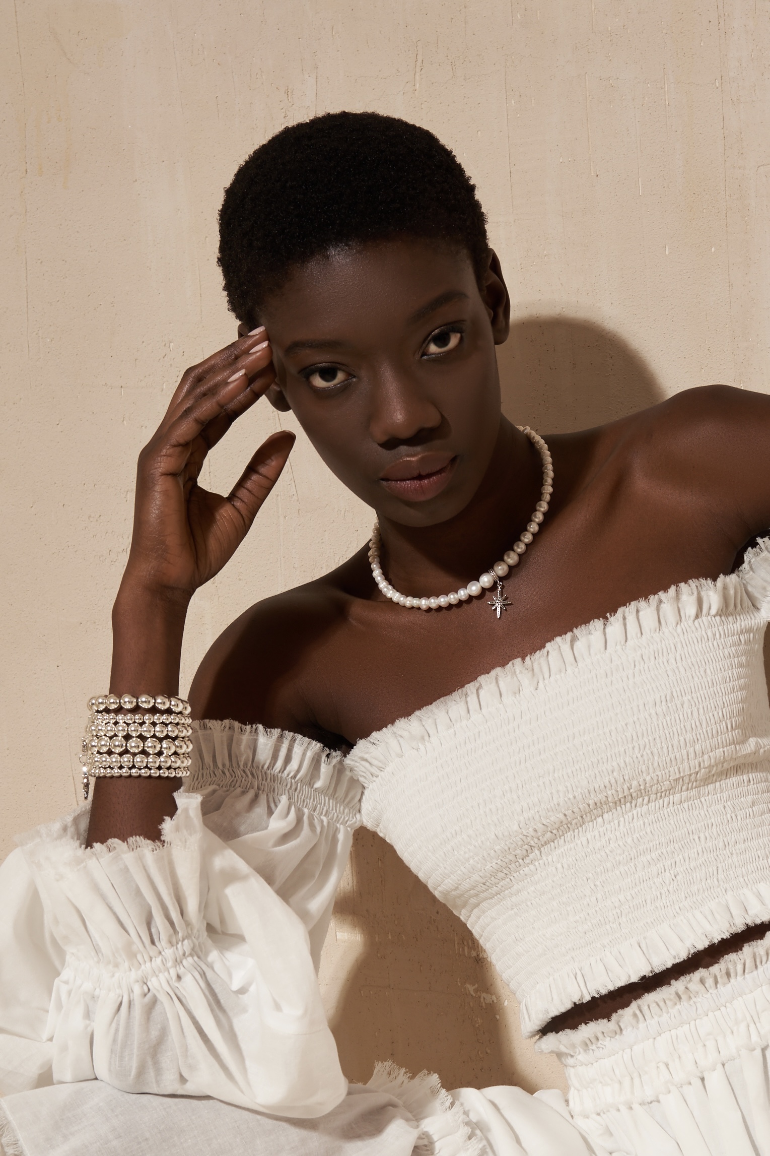 A classic string of pearls becomes a modern choker thanks to the addition of a pendant covered with zirconium stones in the shape of a morning star - it will become a real lifesaver for every day! Add to jeans with a T-shirt, to light dresses, shirts, corsets and even turtlenecks.