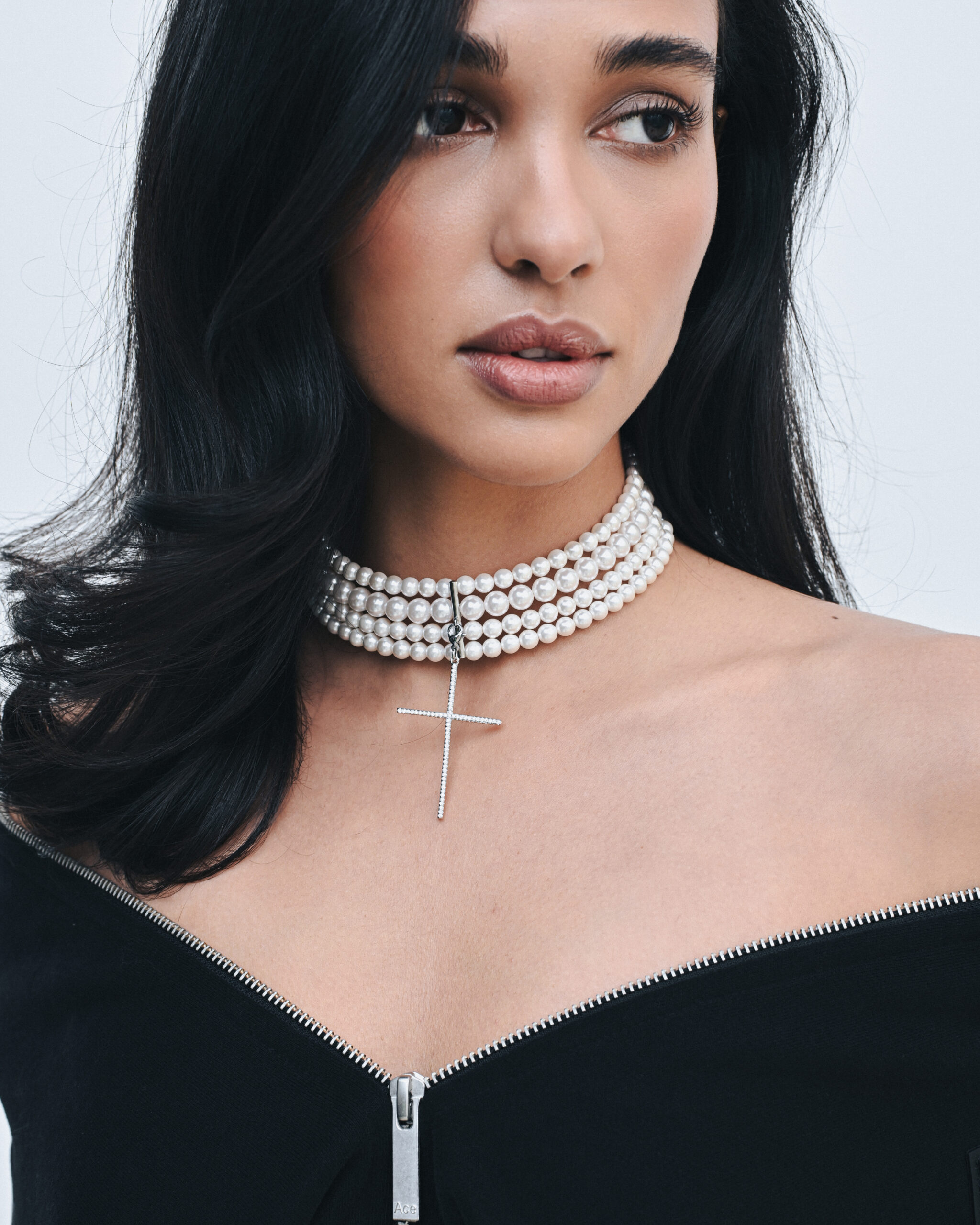 The pendant is made of rhodium-plated brass and inlaid with zircons.