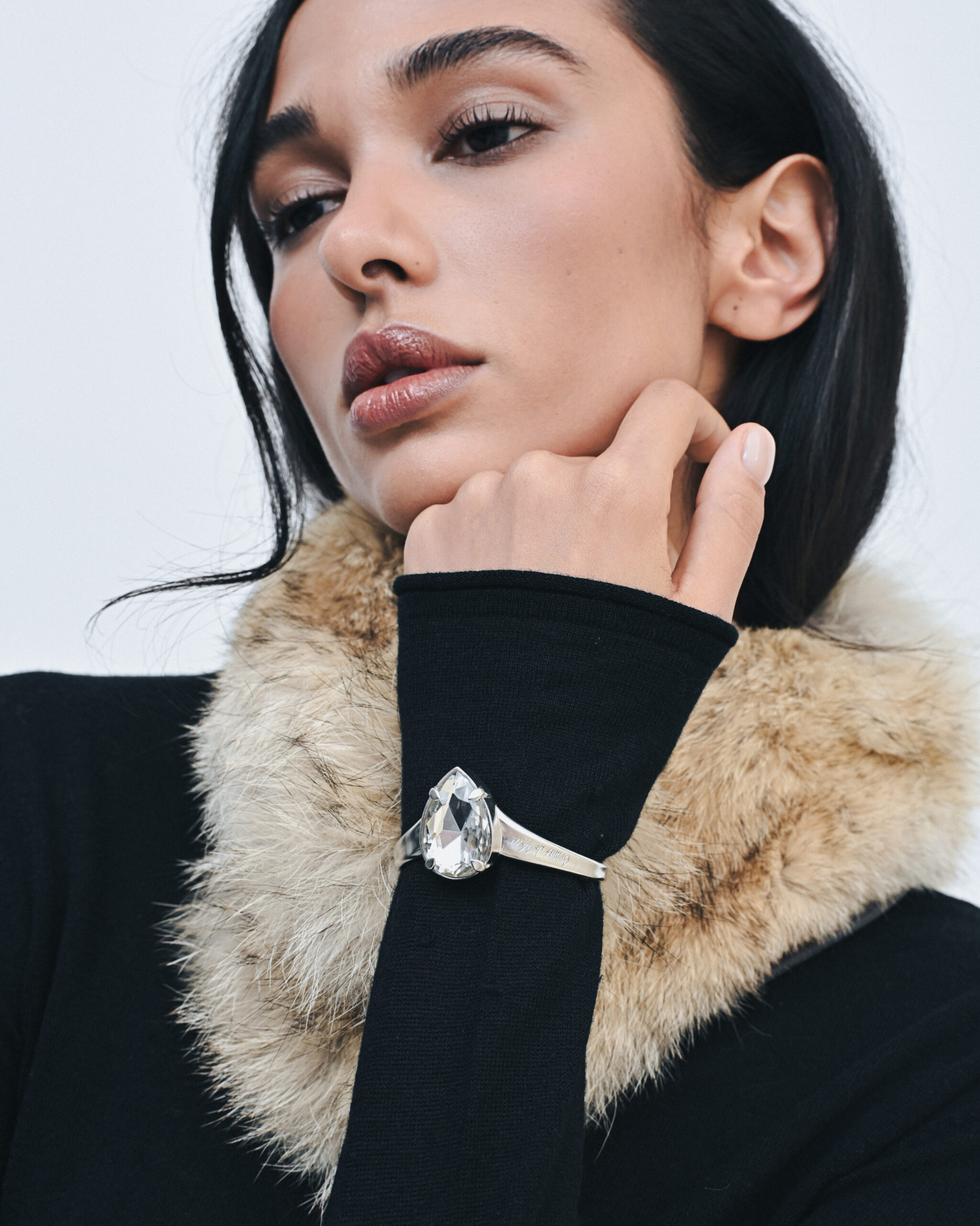 Виготовлено з латуні з родієвим покриттям і доповнено великим кришталем у центрі. Регульований розмір. Без нікелю.