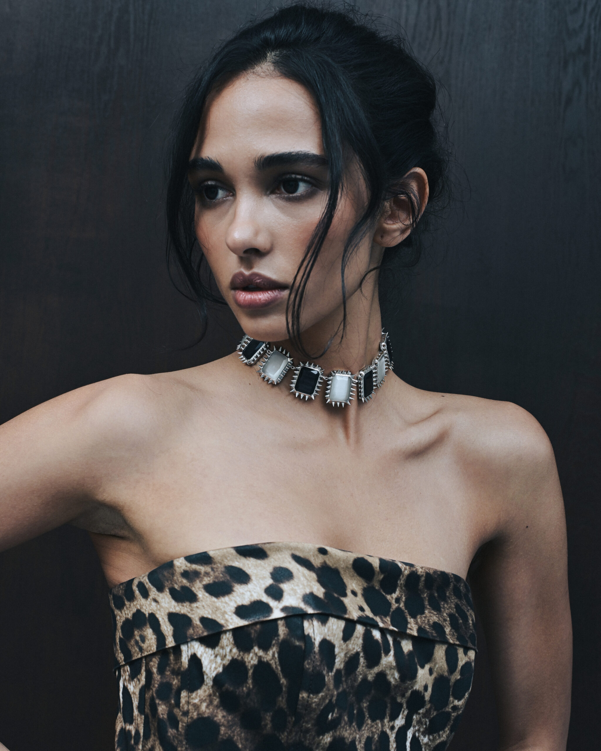 The choker is made of 925 sterling silver with a rhodium coating, the stones are jewelry glass.