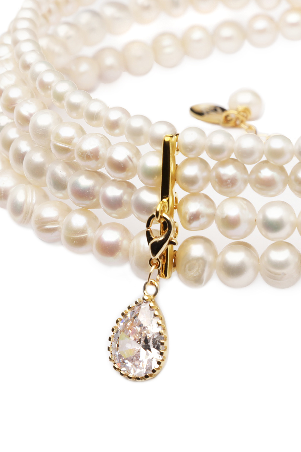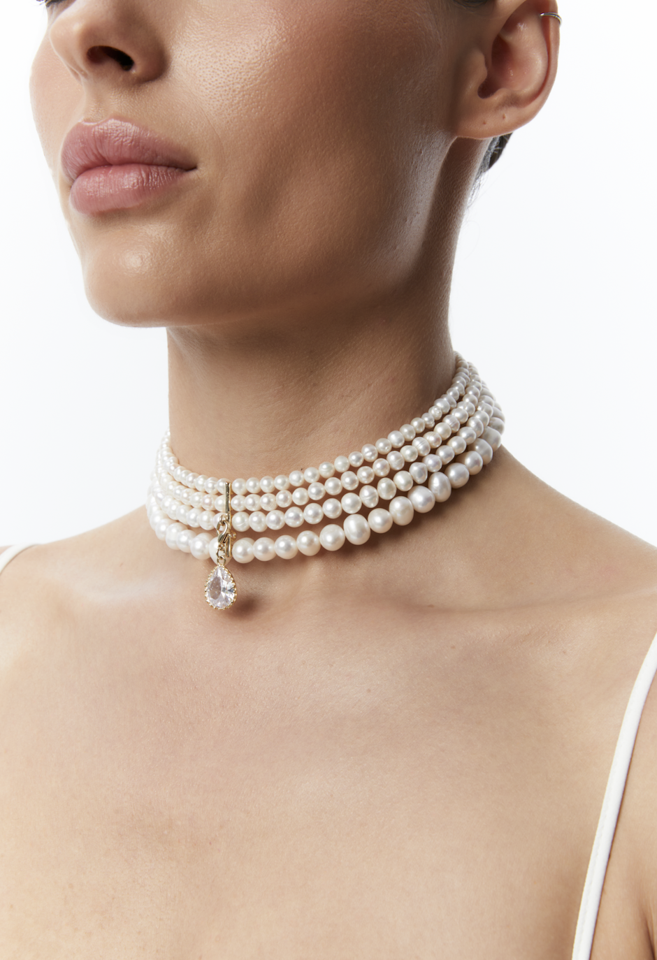 Класичний дизайн перлового кольє, що залишається поза часом, але в новому прочитанні від бренду GRAINS DE VERRE. А підвіска у вигляді краплі з каменю Сваровскі додає яскравості!