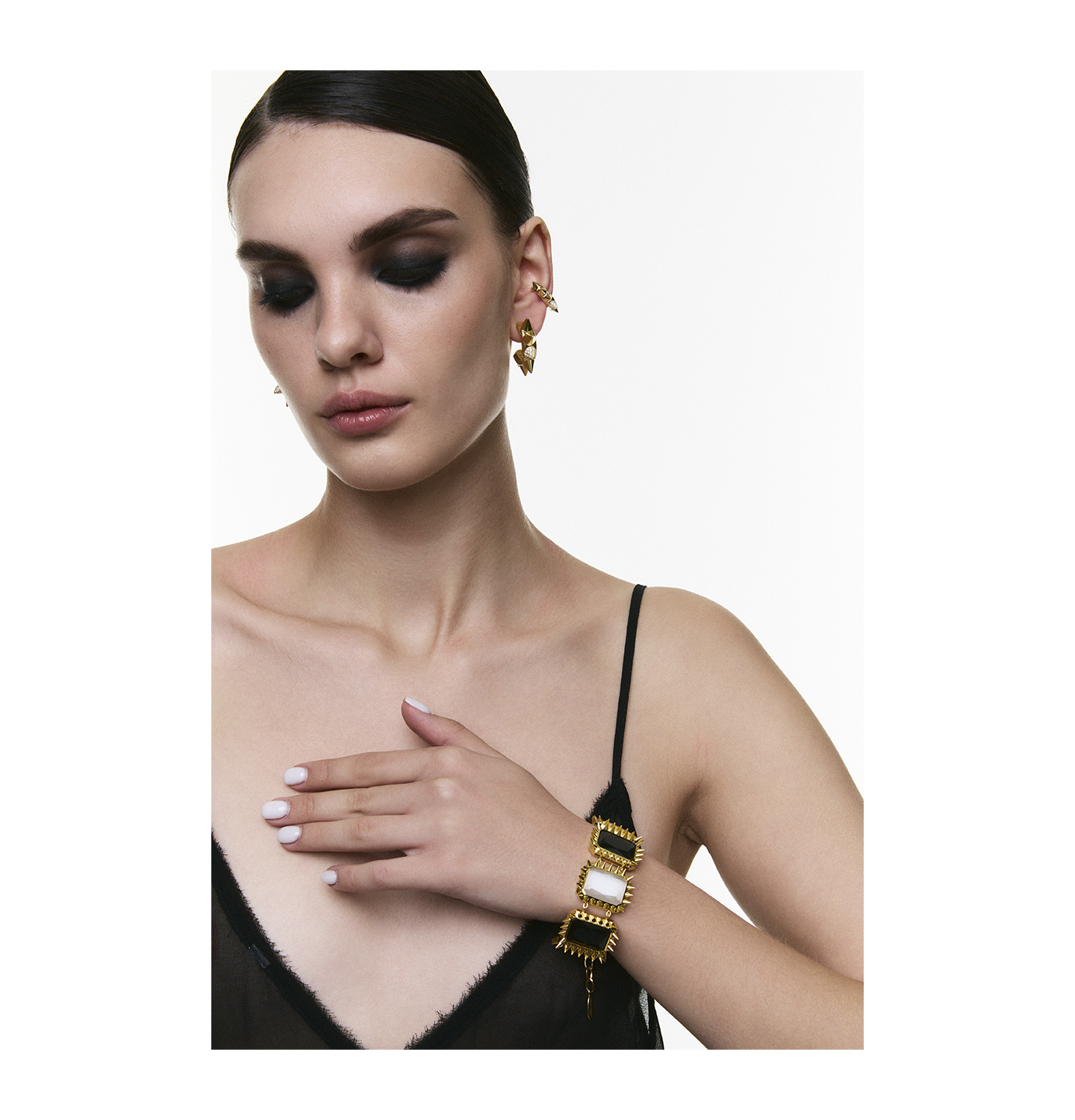 Браслет виготовлений зі срібла 925 проби в позолоті, каміння — ювелірне скло.